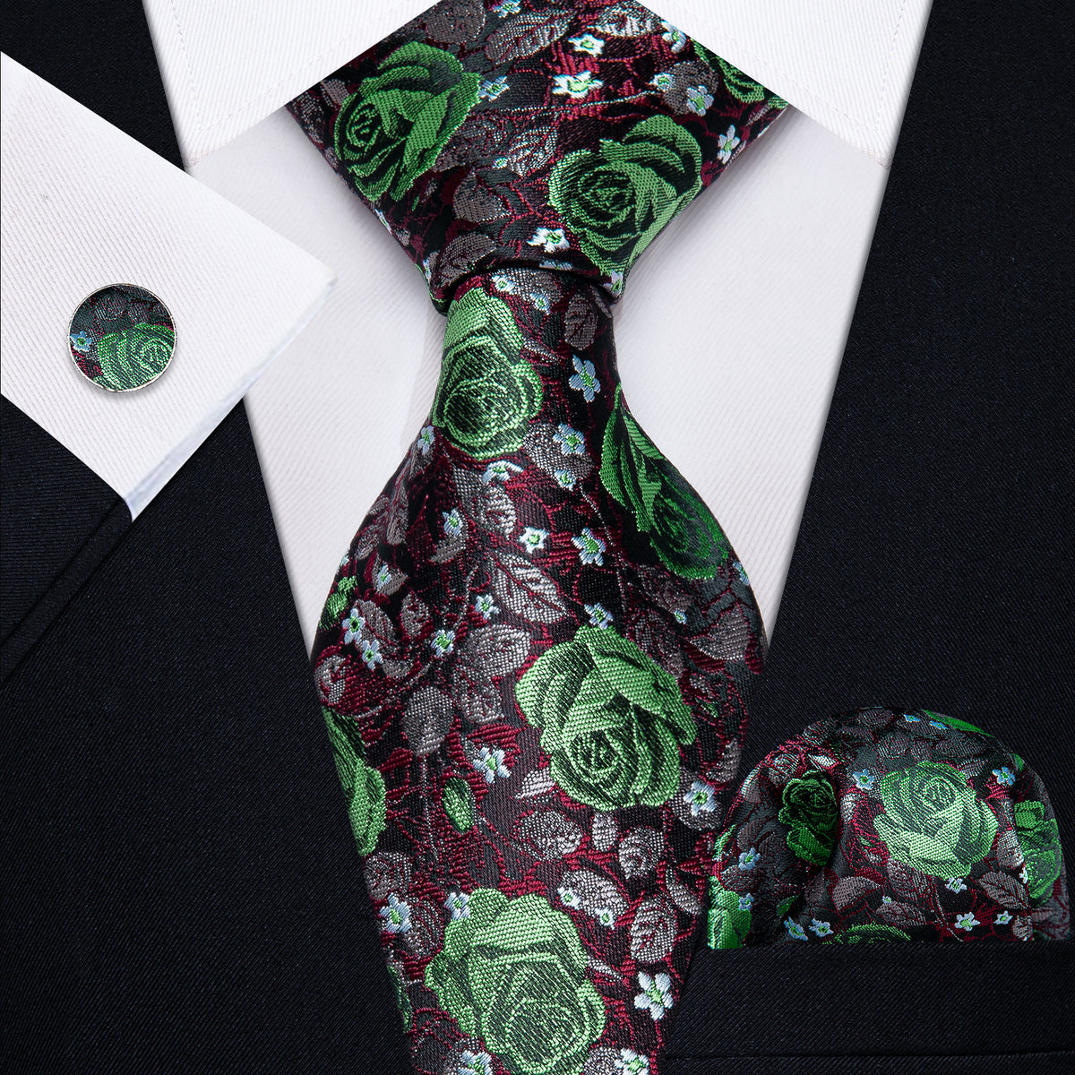Green, Red and Black Floral Silk Tie, Pocket Square and Cufflinks