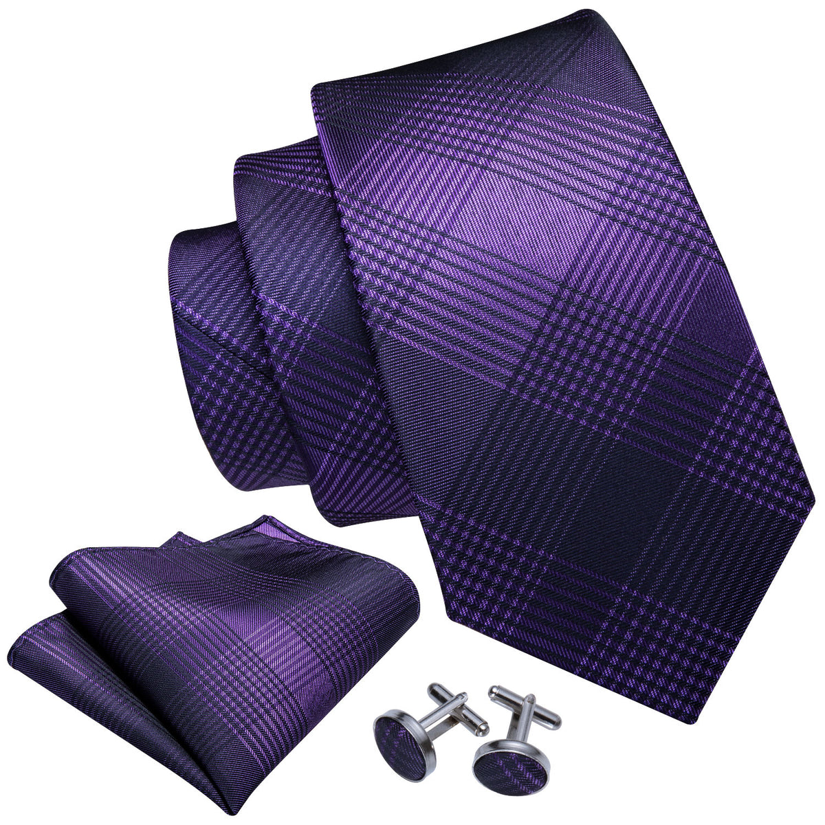 Purple & Black Stripe Plaid Silk Tie, Pocket Square & Cufflinks Set